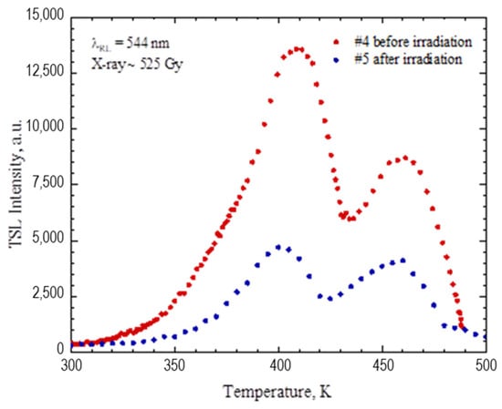 In addition, the temperature dependence of the total scintillation yield and the spectral distribution before and after irradiation with a 10 MeV electron beam were measured with X-ray excitation by the URS-55A apparatus (Ekaterinburg, Russia) with the BSV-2 X-ray tube (30 kV, 10 mA, Cu anode). The radioluminescence (XRL) was detected using a LOMO MDR-23 monochromator (LOMO, Russia) with a spectral resolution of 2 nm and a photon-counting FEU-106 photomultiplier tube. The same bench was used to evaluate thermostimulated luminescence (TSL) above room temperature.