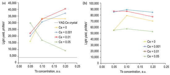 The results of measuring the light yield upon excitation with α-particles are depicted in Figure 8a. Straight lines on the plots connect the points with the different concentrations of Tb for better perception.