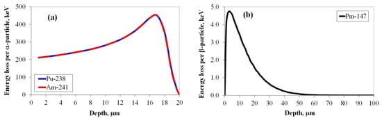 The profiles of the energy losses in (Gd,Y,Tb,Ce)3Al2Ga3O12 material for 5.5 MeV α-particles and β-particles having a spectrum of 147Pm [58] are shown in Figure 9.