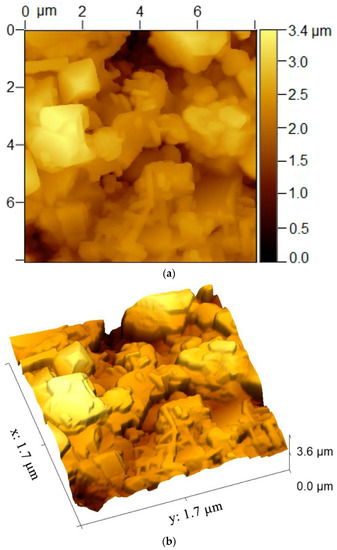 Then, the initial substrates were thinned to a thickness of 400 µm by sequentially changing emery and polishing mixtures during mechanical grinding. Finishing mechanochemical polishing was carried out using diamond powder in a natural wax medium. As a result, the level of surface roughness was brought up to tenths of a micrometer. After mechanochemical treatment, the ceramic was a low-porosity material in the form of a conglomerate of randomly oriented single-crystal blocks with a crystallographic faceting and with an average grain size in the range of 1–2 µm (Figure 1a).