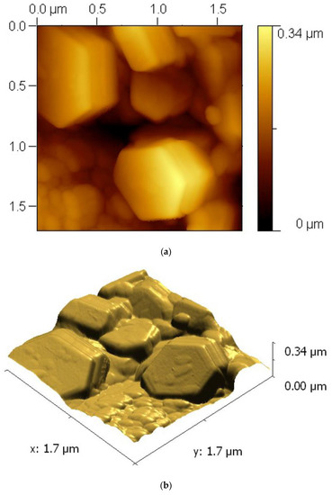 AFM methods give insight into the changes that occur with the surface under ion beam exposure. In general, there is an improvement in the quality of the PZT substrate surface. The absolute height difference before the ion beam planarization of the substrate exceeded 3 μm (Figure 4). Dark areas on the AFM images (Figure 4) correspond to the above-mentioned near-surface cavities. The picture changes after ion beam planarization (Figure 5): the surface relief becomes smoother, and the substrate surface acquires a plane-parallel form. Crystallites obtain a pronounced hexagonal shape, and their faces become parallel to the growth surface, with a small angular dispersion relative to it. Open cavities remain on the surface, but their position changes during planarization, because they are closed in some places due to redeposition of the planarizing layer material into them while they are opened in others.