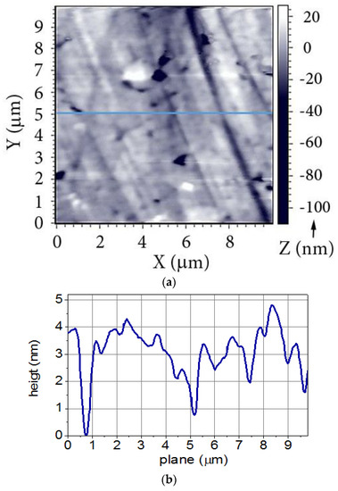 The state of the substrate surface is inherited by the overlying layer of garnet ferrite, as evidenced by the agreement between the results of SEM and AFM studies. The value of the maximum protrusions and depressions on the ferrite garnet surface in the YIG/TiO2/PZT heterostructure is no more than 35 nm (Figure 6), the number of which does not exceed 20% by area. The root-mean-square roughness at a base length of 4 µm along the horizontal AFM line (Figure 7a) is 9.7 nm. This is much smaller than the typical grain crystallite size of the initial PbZr0.45Ti0.55O3 ceramic substrate (Figure 1a). Comparison of these parameters is quite correct, since the edge protrusions of the crystallites of ceramic materials and the places of their joining, which extend beyond the surface plane, are the main relief-forming factors of the surface that determine its morphological features.
