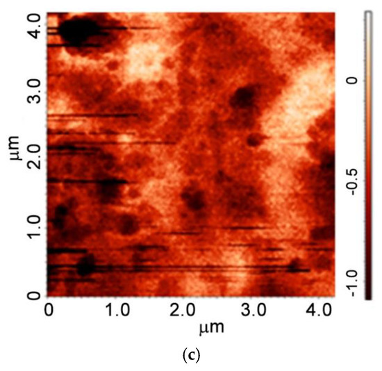 Individual cylindrical magnetic domains in the form of dark rounded areas associated with transverse magnetization are noticeably distinguished in the MFM image (Figure 7c) of the YIG ferrimagnetic layer surface. These regions are due to the magnetic defects contained in them, which slow down the domain wall’s motion during magnetization. A higher coercivity, compared to the surrounding areas of the film, makes it difficult for them to remagnetize, and they remain unremagnetized, while the film as a whole is remagnetized to saturation in the opposite direction. The relationship between structural inhomogeneities and magnetic defects is most clearly indicated when comparing the MFM image (Figure 7c) with the AFM image (Figure 7b) of the same surface area. Light and dark areas of approximately the same shape in these figures complement each other in contrast.