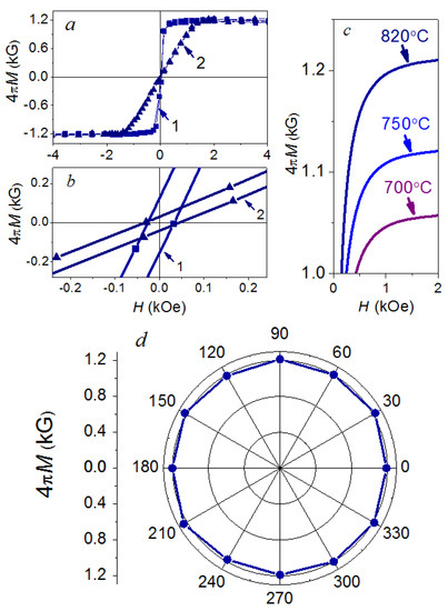 Magnetic hysteresis curves of the YIG layer in the YIG (2 μm)/TiO2 (0.2 μm)/PZT (400 μm) heterostructure after annealing at 820 °C in parallel (1) and perpendicular (2) mutual orientation of the magnetizing field and layer plane (a). Enlarged section of curves in the low fields region (b). Initial magnetization curves at various annealing temperatures (c). Polar diagram of the YIG layer in-plane saturation magnetization in 1 kOe magnetic field (d). All measurements were conducted at 300 K.