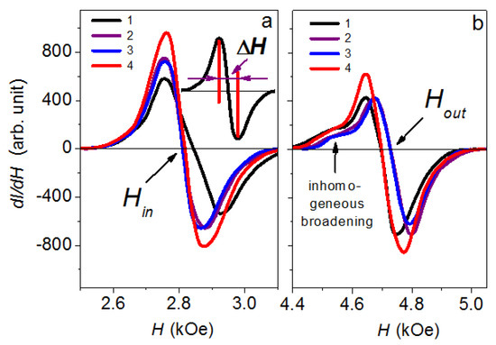 The FMR spectrum is sensitive to local spatial variations of the magnetic field in a matter made by numerous structural inhomogeneities and defects. This leads to different resonance conditions on dissimilar sample parts, and hence is responsible for the inhomogeneous broadening of the FMR line. The inhomogeneous broadening is most distinct when the magnetizing field H0 is oriented perpendicular to the sample (Figure 9b).