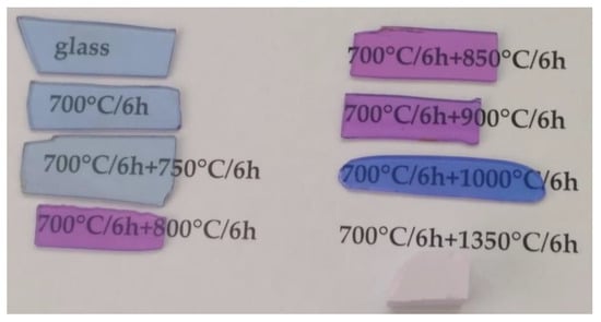 For this study, we have chosen the glass of the composition 18 Li2O, 27 Al2O3, 55 SiO2 (mol%) [23], 5 mol% Y2O3, 5 mol% Nb2O5, and 0.1 mol% CoO were added above 100% as nucleators and colour dopant, respectively. The reagent-grade raw materials were supplied by Nevareactive, Saint Petersburg, Russia. The batch weight was 300 g. The glass was melted in air in a home-made crucible made of quartz ceramics at 1560 °C for 4 h with stirring, and then poured out onto a metal plate and annealed at 620 °C for 1 h. Then, the furnace was switched off and the glass was cooled down with the annealing furnace. The transparent violet-blue-colored initial glass was heat-treated in isothermal conditions from 700 to 1350 °C for 6 h by the two-stage heat-treatments with the first hold at 700 °C for 6 h. The heating rate was 5 °C per minute.