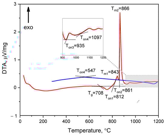 The first set of DTA measurements was conducted using conventional heating and cooling rates of 10 °C/min. Several thermal effects were observed: a glass transition at 697 °C, followed by three exothermic peaks with onset temperatures at 782 °C (broad and non-intense), 828 °C (sharp and intense), and 913 °C (very weak). No significant effects were observed during the cooling process. With the aim to reveal the possible thermal effect of the tetragonal–monoclinic phase transition upon cooling, we increased the heating and cooling rate, and the second set of DTA measurements was performed at a heating and cooling rate of 30 °C/min. The increased heating and cooling rate resulted in a shift of the thermal effects towards higher temperatures, and two additional weak features were revealed on the DTA curves. Figure 2 displays the data obtained from the second set of DTA measurements. Consequently, the DTA curve of the initial glass exhibited a glass transition temperature (Tg) at 708 °C and four exothermic peaks during heating (Figure 2). The first broad exothermic peak occurred at Ton1 = 812 °C, where Ton1 is a crystallization onset temperature, indicating the onset of crystallization of the nucleator in the form of the T’-phase. This peak was followed by a sharp and intense peak at Ton2 = 861 °C, corresponding to the crystallization of β-quartz ss. Two small, broad peaks were observed at Ton3 = 935 °C and Ton4 = 1097 °C. The peak at Ton3 = 935 °C was attributed to the T’-phase to T-phase transformation, while the small peak at Ton4 = 1097 °C was associated with the formation of β-spodumene ss. The DTA curve collected on cooling showed an inflection point at temperature of 547 °C. This observation suggests the existence of a weak thermal effect, which may be attributed to the phase transition from the T-phase to the M-phase, which is known to be a continuous second-order transition [27]. To further support this suggestion, HT-PXRD investigations were conducted and the results are described in detail below.