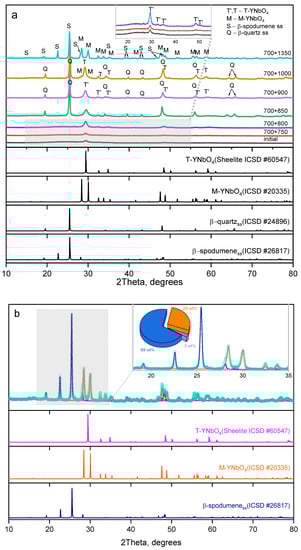 XRD patterns of the initial and heat-treated glasses: (a) initial glass and glasses subjected to two-stage heat treatments at indicated temperatures, °C. The appropriate letters are used to indicate the primary peaks of the crystalline phases. (b) results of the phase analysis of the glass heat-treated at temperatures of 700 °C + 1350 °C using Rietveld method (Rwp = 8.35%). The inserts display the magnified Bragg angle ranges containing the most intense peaks of all crystalline phases for improved visibility. The pie plot represents the quantified phase composition (mass%), where blue corresponds to β-spodumene ss, orange to the M-phase, and light violet to the T-phase. The duration of each hold is 6 h. The diffraction patterns are shifted along the vertical axis for the convenience of observation.