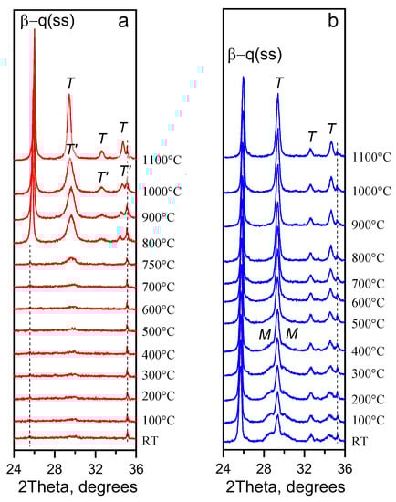 According to Figure 4a, above 700 °C, nanocrystalls of T’-YNbO4 continue to grow from the initial glass containing traces of the T’-phase of yttrium niobate. Crystallization of β-quartz ss begins at 800 °C. The temperature raise to 1100 °C leads to the transformation of the distorted tetragonal T’-YNbO4 to the high-temperature sheelite-like tetragonal structure. Thus, XRD patterns collected in situ upon heating demonstrate no evidence of low-temperature monoclinic phase (M-YNbO4) and argue for sequential transformations of the yttrium niobate phase from the metastable distorted tetragonal T’-phase to the thermodynamically stable at high temperatures sheelite-like one. Nanocrystals of M-YNbO4 are formed from the high-temperature tetragonal phase with sheelite-like structure upon cooling in the temperature range between 600 °C and room temperature, see Figure 4b.