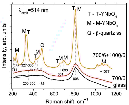 In the Raman spectrum of the initial glass (Figure 5), the broad band of about 480 cm−1 and a shoulder at 880 to 900 cm−1 are due to vibrations of the aluminosilicate glass network with a large number of non-bridging oxygens [31] and of [NbO4] and [NbO6] polyhedrons in the glass structure [32], respectively. The broad band at ~1000 cm−1 corresponds to vibrations of [SiO4] tetrahedrons in the aluminosilicate glass network. A very weak broad band at about 200–350 cm−1, as well as the intense band at 806 cm−1, reveal the beginning of formation of distorted orthoniobate T’-YNbO4 crystals with disordered fluorite-type structure [6,7,33]. The Raman spectrum of the glass-ceramic obtained by the heat-treatment at 1000 °C for 6 h gives the evidence of the absence of T’-phase (the disappearance of the broad band at about 200–350 cm−1). A number of distinct bands appear in the Raman spectrum of the sample. The bands at 482 and 1077 cm−1 reveal crystallization of the β-quartz ss [34]. The complex shape of the broad band with the maximum at ~1077 cm−1 is due to luminescence of Er3+ ions, the unwanted impurity in the reagent of yttrium oxide [7]. The bands at ~330, ~420, ~660, and 806 cm−1 belong to vibrations of [NbO4] tetrahedrons in the T-YNbO4 crystals [35]. Since the frequencies of the main Raman bands of the T- and M-YNbO4 crystals are very close [35], unambiguous judgment about the appearance of the M-phase is possible by the appearance in the Raman spectrum of two intense bands at 235 and 690 cm−1 and two weak bands at ~211 and ~435 cm−1. Thus, according to Raman spectroscopy findings in the sample heat-treated at 700 +1000 °C for 6 h, the tetragonal and monoclinic crystals of YNbO4 coexist, which is in accordance with the XRD findings, see Figure 3a.