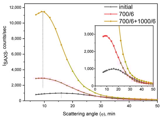 The maximum on the SAXS curve from the initial glass presented in Figure 6 is observed at a scattering angle of about 16’. So the average distance between scattering regions estimated by the Equation (3) is about 180 Å. As can be seen from Figure 6, low-temperature heat-treatment at 700 °C for 6 h leads to a shift of the maximum to smaller angles of ~10’ and, accordingly, to an increase in the distance between the inhomogeneous regions to ~290 Å. After the heat-treatment at 700°C + 1000 °C for 6 h, the position of the maximum on the SAXS curve practically does not change, that is, the geometry of the structure and the distribution of regions of inhomogeneity do not change. The radii of scattering regions increase from ~50 Å for the initial glass to ~80 Å for the glass heat-treated at 700 °C for 6 h and to ~100 Å for the glass-ceramics prepared by the heat-treatment at 1000 °C at the second stage. The main reasons for the increase in the intensity of SAXS during high-temperature heat-treatments are structural transformations within the inhomogeneous regions resulting in the crystallization of the YNbO4 phase.