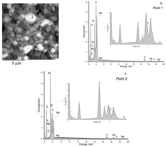 According to Figure 8b and Table 2, the bright round-shaped crystals denoted by the number 1 in Figure 8a consist of yttrium, niobium, and oxygen ions. We also conducted EDX analysis of the other round-shaped particles of different sizes and found that they have a very similar elemental composition. Aluminum and silicon ions that appear in the EDX spectrum in Figure 8b probably come from the surrounding matrix and from the rod-like crystals located nearby (we should bear in mind that aluminum oxide is more resistant to hydrofluoric acid than silica). Figure 8c presents the results of the EDX analysis of the material from the point 2 in Figure 8a. Point 2 was chosen as a place where a number of the rod-like crystals are located, see Figure 8a. This composition is enriched in aluminum and silicon and depleted in yttrium and niobium as compared with the composition in the point 1.