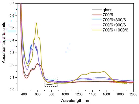 Absorption spectra of the initial and heat-treated glasses. The values presented in the figure denote heat-treatment temperatures and time (°C/h). The samples thickness is ~1 mm. The spectral range marked with the dotted line shows the steps due to the change in detectors.