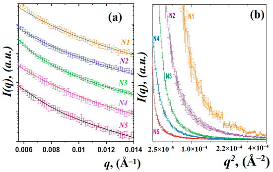 SAXS curves of the studied glass materials and their approximation by function (a). Guinier plots for the SAXS experimental data (b).