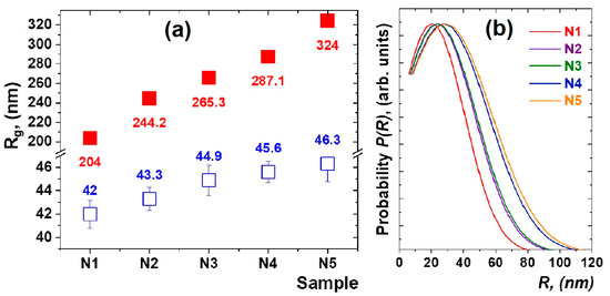 The values of the gyration radii Rg1 (red close squares) of the density fluctuations and Rg2 (blue open square) of nanoparticles, which were calculated from the analysis of the SAXS data for the studied glass materials. The obtained values are normalized to the corresponding values for N1 sample (a). The distribution of average sizes of nanoparticles in the studied glass samples obtained by Equations (3) and (4) (b).