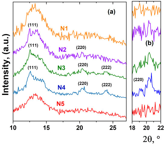 As an important aspect, the structural mechanisms of PbF2:Tm-Ho nanoparticle formation can also be explained by the detection of the crystalline or amorphous state of the luminescent nanoparticles. X-ray diffraction patterns for the studied glass samples are shown in Figure 3. All diffraction patterns obtained have a typical shape for scattering from amorphous materials. However, on the X-ray diffraction pattern corresponding to samples N2, N3 and N4, the appearance of several diffraction peaks is observed. The positions of the observed diffraction peaks correspond to the cubic structure with Fmm symmetry and indicate the PbF2 phase [5,14]. We believe that the rare-earth ions became embedded in crystals of PbF2 because the unit cell parameter of this phase changes slightly with increasing thulium and holmium oxide concentration, which indicates the entry of Ho3+ and Tm3+ ions into the crystal structure of the luminescent nanoparticle PbF2:Tm-Ho. Here, it is declared that the spectral characteristics of up-conversion luminescence correspond to those related to the cubic crystal structure of PbF2 crystal [4,33].