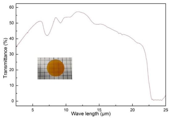 Transmittance spectrum of the polished Fe0.01Zn0.99Se transparent ceramic sintered at 950 °C for 30 min under a pressure of 60 MPa by SPS. Reprinted with permission from [88], © The American Ceramic Society (Westerville, OH, USA) 2019.