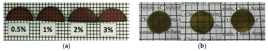 In [88,89,112], chemical precipitation from solution was also used to synthesize Fe2+:ZnSe powders. Sodium hydroselenide NaHSe was used as the source of Se ions; ZnCl2 and FeCl2 4H2O were used as the sources of metals. The obtained particles had a good morphology (Figure 4b). A broad particle size distribution of 50–1100 nm was observed, with the major mode of 70% in the range of 300–600 nm. The maximum Fe2+ concentration in zinc selenide was 6 at% (~3.3 × 1020 cm−3), which is 1–2 orders of magnitude higher than that achieved by traditional doping methods. The ceramic samples obtained with different dopant concentrations are shown in Figure 5a. Fe2+:ZnSe ceramics fabricated from mechanically crushed powders are also shown (Figure 5b). In this case, the particle size varied from 0.7 to 35 μm, with 90% of the particles having a size within 1.06–14.2 μm [101].