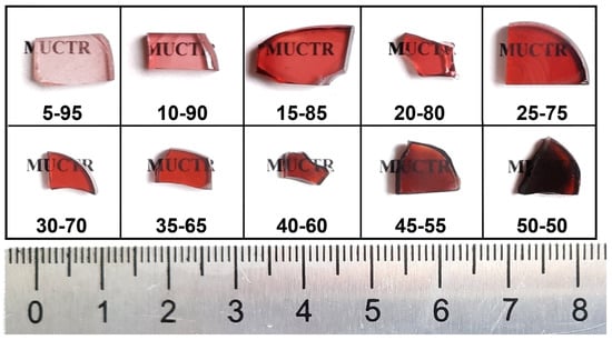 The synthesized samples had a ruby-red color, which became more saturated with an increase in the bismuth oxide content (Figure 1). Samples containing >40 mol% Bi2O3 had color inhomogeneity, probably caused by heterogeneous component distribution in the glass.