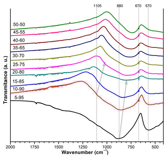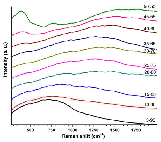 Structural units in the glass network were characterized using Raman and IR spectroscopy (Figure 2 and Figure 3). In the low-frequency region (<700 cm−1) for the Raman spectra (Figure 2), the bands in the region of 500 cm−1 characterized [GeO4]-tetrahedra vibrations. Their intensity decreased with a reduction in germanium oxide concentration [,]. Additionally, in this region, there was a wide band at 600 cm−1, related to vibrations of the Bi–O bond of [BiO6]-octahedra []. It is interesting that for the 50-50 glass, the band at 395 cm−1, associated with the bending of the O–Ge–O bridge bond [], had the highest intensity in comparison with other glasses. It can be explained by the tendency of this glass to surface crystallize GeO2 phases.