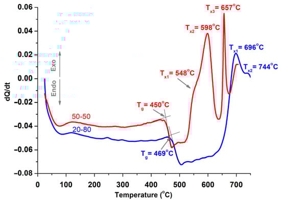 DSC curves of 20-80 and 50-50 synthesized glasses.