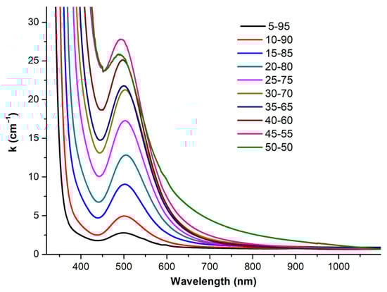 The absorption spectra of glasses (Figure 5) exhibited a characteristic shoulder at 500 nm associated with BACs [,,]. The absorption coefficient in this region increased with the growth of the bismuth oxide content.