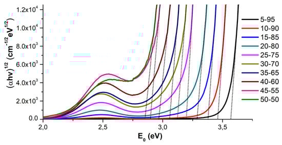 Similarly, with an increase in the bismuth oxide content, the short-wavelength absorption edge shifted from 340 nm (Sample ID 5-95) to 425 nm (Sample ID 50-50). This shift was due to the fact that the optical band gap of bismuth (III) oxide is smaller than that of germanium oxide (5.63 eV) and ranges from 2.5 to 3.2 eV for various Bi2O3 polymorphs [].