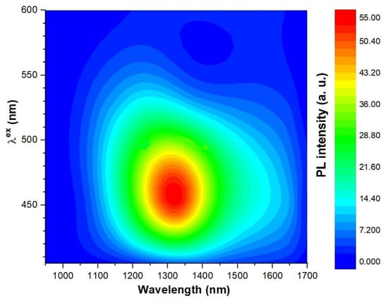 The PL spectra of glasses at λex = 450 nm (Figure 8) represented a wide band in the near IR region. As can be seen, the luminescence region corresponded to the data of [,,,], which additionally confirms the presence of BACs in glasses. For tested glasses, when the bismuth oxide content increased, the PL intensity became lower due to concentration quenching.