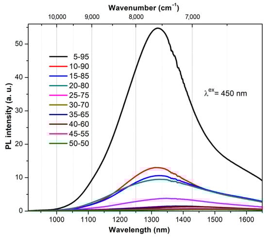 Under excitation of photoluminescence (PL) at wavelengths of 405, 425, 525, 650, and 805 nm for 5-95 samples (Figure 7), it was found that 450 nm was the optimal excitation for BACs (see Figure S19). We observed that a green laser (525 nm) action led to strong heating of the glasses, which significantly decreased the PL intensity.