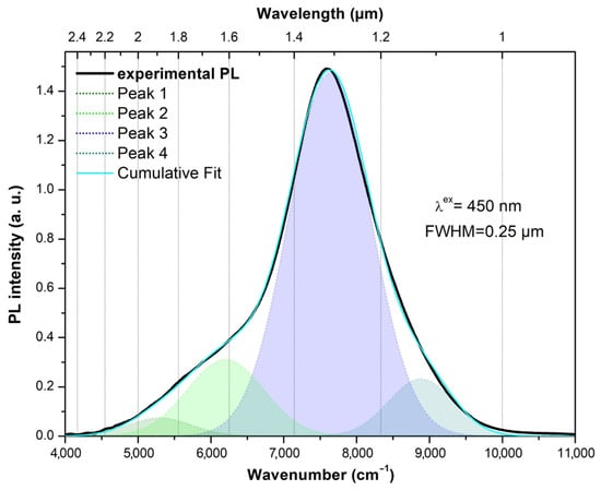 Analysis of the optical absorption and luminescence spectra of the synthesized glasses (λex = 450 nm) showed the presence of BACs, the number of which increased with the bismuth oxide total concentration growth. The contour of the PL spectrum in the IR region was represented by a superposition of several bands, whose maxima, determined from the Gaussian components, were located at wavelengths ~1125, 1310, 1615, and 1885 nm (Figure 9). According to [,], the bands at 1125 and 1310 nm corresponded to the 3P1 → 3P0 transitions for the Bi+ ion and the 2D3/2 → 4S3/2 transitions for Bi0, respectively.