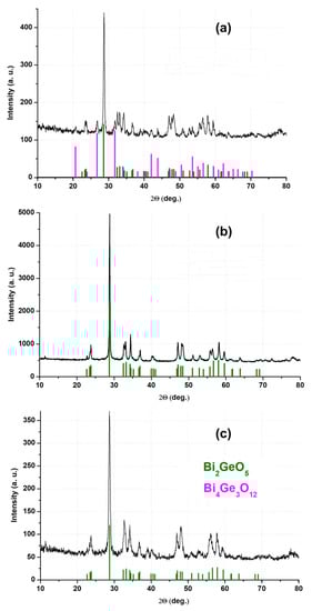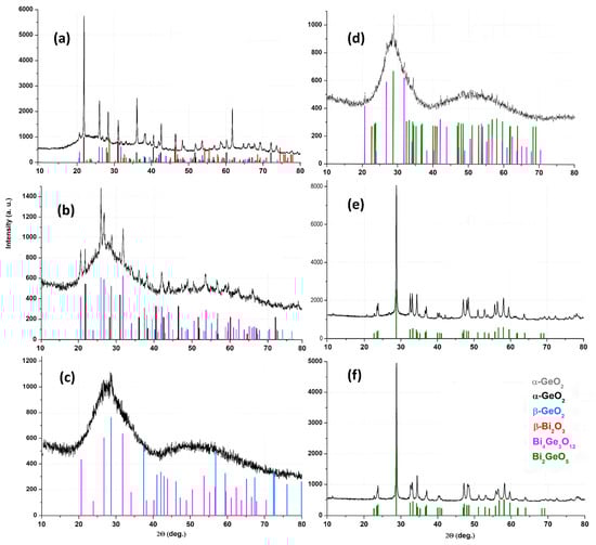 Crystallization in the 550–640 °C temperature range leads to the formation of the Bi4Ge3O12 phase [,,], alone or together with other phases for glass compositions containing 10–40 mol% Bi2O3. Therefore, the crystallization peaks belonging to the 650–663 °C range can be associated with the maximum crystallization temperature of the Bi4Ge3O12 phase (Figure 11). The crystallization peaks in the 690–744 °C range can be associated with the crystallization temperature of the β-GeO2 phase for samples with a high content of GeO2 or other phases for samples with a high content of Bi2O3.