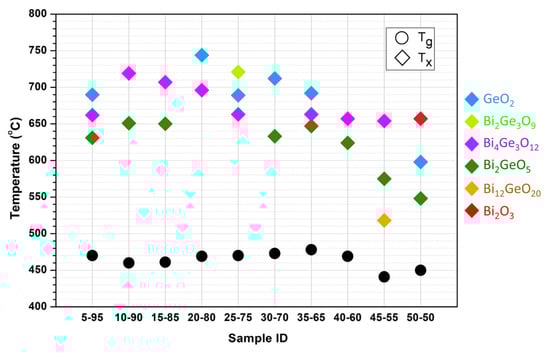 The presence of several crystallization temperatures was associated with the formation of various crystalline phases. The difference in the number of crystallization temperatures (2 or 3) for different compositions can be associated both with a change in the type of crystallizing phases and with a rather high heating rate of the samples during the DSC processing. The formation of the metastable Bi2GeO5 phase could be observed in the 600–650 °C temperature range, according to []. The crystallization temperature in the region of 650–700 °C may correspond to the transition of the metastable Bi2GeO5 phase to the stable Bi4Ge3O12 with the eulytite structure []. The shift of the crystallization temperatures of the same phase towards high values for glasses with a Bi2O3 content <30 mol% is explained by the lower tendency of these glasses to crystallize (Figure 4).