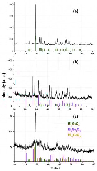 In addition to active optics, bismuth-germanate glasses are used to produce glass-ceramic materials since the glass formation region of the Bi2O3-GeO2 system includes the compositions of different crystalline phases: “metastable” Bi2GeO5 with ferroelectric characteristics [], and Bi4Ge3O12 with scintillation properties [].