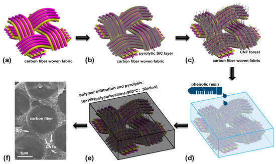 The structure and preparation of the Cf-MWCNT/SiC composites: (a) Woven fabric made of carbon yarns; (b) Pyrolytic SiC layer coated on the fabric; (c) Synthesizing MWCNTs on fabric surface; (d) Impregnate fabrics with phenolic resin; (e) PIP treatment; (f) SEM image of Cf-MWCNT/SiC composites at a micro-scale.