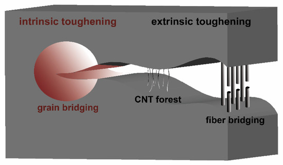 Schematic illustration of strength and fracture behavior in terms of intrinsic (brown color text) versus extrinsic (black color text) toughening mechanisms.