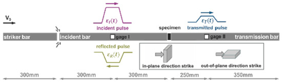 The split Hopkinson pressure bar (SHPB) technique is a powerful tool for investigating the dynamic response of high-performance ceramic matrix composites. It enables direct measurement of their strength, stiffness, fracture behavior, and stiffness degradation under high strain rate loading conditions. It is designed based on the principle of one-dimensional wave propagation. Figure 3 shows the schematic illustration of the SHPB that consists of a striker bar, incident bar, and transmission bar made of cold roll steel. The striker bar is accelerated by high-pressure nitrogen gas and sequentially strikes the incident bar at the speed of , where the pulse is initiated at the interface between them. The gas pressure, bar length, and material property of striker determine the amplitude and velocity of initial flat-topped pulse that is monitored by the gage mounted in the middle of the incident bar. This pulse is separated into reflected pulse and a transmitted pulse that is at the interface between incident bar and the specimen. The transmitted pulse transfer within the specimen, and the pulse propagation are affected by specimen’s deformations and fractures. At the interface of specimen and transmission bar, the pulse has a second reflection/transmission separation. In the end, the transmitted pulse, containing the information on specimen fracture characteristics, transfers into the transmission bar and is collected by the gage II. Based on the working principle described here, SHPB can precisely detect the signal of deformation and the fracture of the materials.