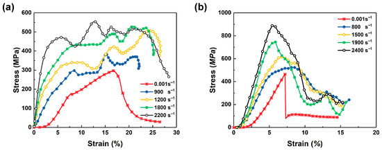 Figure 6 shows the stress–strain results of the Cf-MWCNT/SiC composites at different impact strain rates. The quasi-static result tested at 0.001 s−1 strain rate in out-of-plane direction (Figure 6b) shows the composites failed at ~8% strain with a sudden and catastrophic break, implying the main failure behavior is dominated by ceramic matrix. However, the quasi-static result tested in the in-plane direction (Figure 6a) shows a different response, in which the curve has two linear regions before reaching the peak stress, with a yield point at ~8% strain. In the first linear region, the initial modulus is related to the ceramic matrix’s elasticity, while we observed the surface deformation of the sample under the compression crosshead. When the sample was further compressed, fabric reinforcements sequentially bore the force layer by layer and transferred to the surrounding matrix, resulting in an increase in the stress.