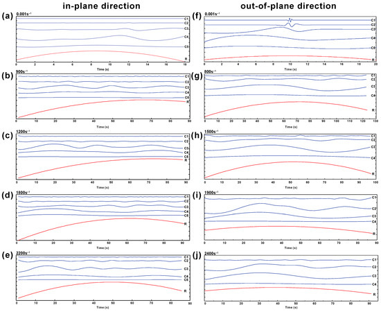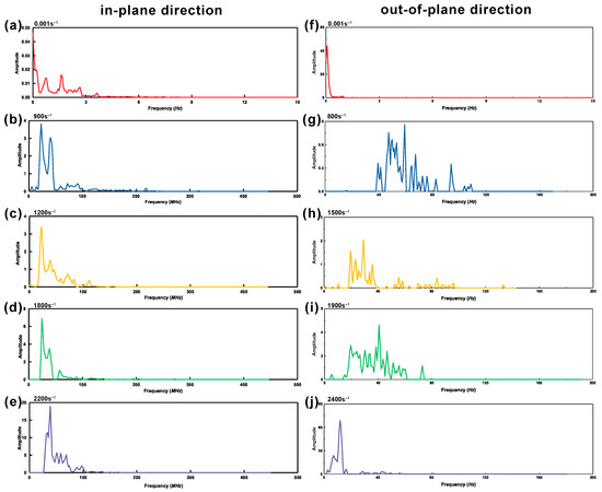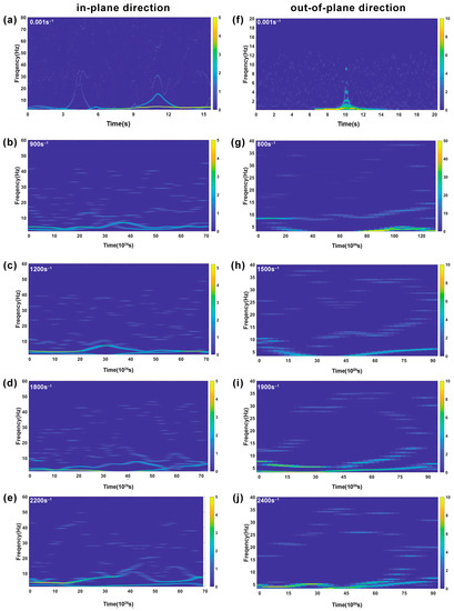 Figure 8f–j show the spectrums of composites tested in the out-of-plane direction. In Figure 8f, a peak exists between 8 s to 12 s, when the failure occurred. Moreover, the frequency amplitudes of samples tested in out-of-plane at different strain rates are much lower relative to those tested in in-plane direction. It represents the fractures that occur when samples are impacted in out-of-plane direction and have a relatively larger deformation as compared to that tested in the in-plane direction. Also, the spectrum’s time spans of samples tested in the out-pf-plane direction (Figure 8g–j) are much longer than those of samples tested in the in-plane direction (Figure 8b–e). This is because the failure stresses of the out-of-plane direction are higher than the in-plane direction at the same strain rate level (check results in Figure 6).