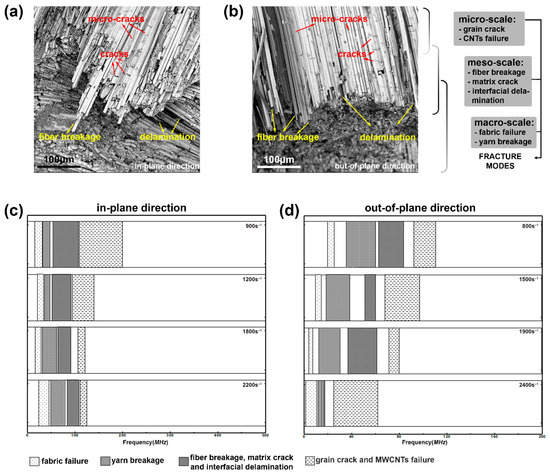 Fractures and deformations in each scale level have different responsive frequencies [36,37,38,39], which however are not constant for each strain rate. A detailed frequency distribution was obtained through a simplification of marginal Hilbert spectrum. Figure 10c,d shows the responsive frequency distributions for high strain rate compressions. The fractures observed from SEM images are divided into four failure modes, including fabric failure, yarn breakage, mesoscale fracture, and microscale damage. Different failure modes have specific frequency bands. For example, the frequency bands of fabric failure, yarn breakage, mesoscale fracture, and microscale damage in Figure 10c correspond to frequency bands 20–30 MHz, 30–50 MHz, 50–110 MHz, and 110–200 MHz, respectively. The correlation of frequency band and failure mode is a crucial tool for future improving high-speed resistant capacity through optimizing the multiscale structure of Cf-MWCNT/SiC composite. The possible approaches to enhance the mechanical response against high strain rate impact include increasing fiber volume fraction and optimizing the length and density of MWCNTs. Moreover, it is found while the strain rate increases, the frequency bands corresponding to different fracture modes become narrow in both the in-plane and out-of-plane directions.