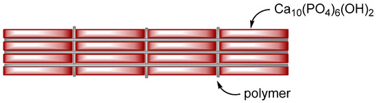 Bone consists of three major components: carbonated apatite (nanometer-sized calcium phosphate crystals), collagen I fibers, and water in a volume ratio of approximately 56–60:30–40:10 [7,8,9]. Carbonated apatite crystals have dimensions of 50 nm in length, 25 nm in width, and 1–4 nm in thickness [10]. The small crystal size of carbonated apatite is advantageous in terms of mechanical strength [11]. When calculating the interface area between carbonated apatite and the organic phase based on the crystal size, it becomes ca. 210 m2/g. The brick-and-mortar structure (Figure 1) formed by carbonated apatite crystals and collagen fibers contributes to the toughness of bone [11,12,13,14,15]. One of the major properties of bone is stiffness, which can support and protect a body from deformation. The elastic moduli of bone range from 2 to 33 GPa, and the bending strengths range from 27 to 308 MPa [10,16]. Water plays an important role in the mechanical properties of bone [8,17,18,19,20]. Water removal causes increased stiffness but decreased toughness in bone [21]. To understand the mechanical function of bone, it is necessary to consider the interfaces and connections between bones and soft tissues. The elastic moduli of the soft tissues are 0.5–1 MPa (cartilage), 50–150 MPa (enthesis), and 0.45 GPa (tendon) [22]. The stiffness of the soft tissues varies depending on the degree of mineralization.