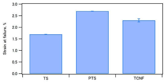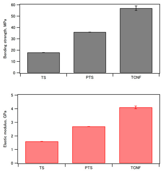 Comparison of bending strength, elastic modulus, and strain at failure, evaluated by three-point bending tests of tapioca starch (TS)–hydroxyapatite, phosphorylated tapioca starch (PTS)–hydroxyapatite, and TEMPO-oxidized cellulose nanofibers (TCNF)–hydroxyapatite composites containing 70 wt% of hydroxyapatite [88,89].