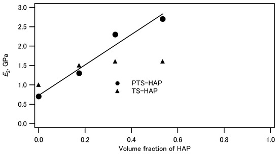 Plot of elastic moduli of phosphorylated tapioca starch (PTS)–HAP composites and tapioca starch (TS)–HAP composites against the volume fraction of HAP.