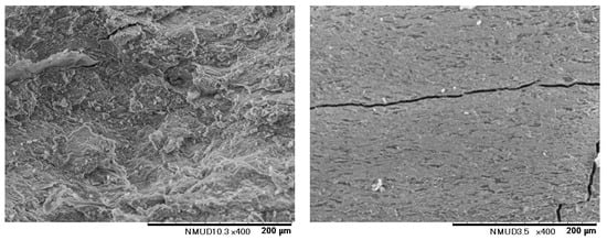 TEMPO-oxidized cellulose nanofibers (TCNF) are obtained by oxidizing the C-6 carbon carrying a primary hydroxy group on the surface of the nanofibers into a carboxy group. The cross-section of the nanofibers consisted of 6 × 6 glucose units, with every other glucose on the surface oxidized to glucuronic acid (Figure 4) [90]. The width is around 3–4 nm, and the length is several micrometers. The carboxylate groups on the surface of nanofibers can bind with calcium ions, and it is expected that if hydroxyapatite crystal nucleation occurs, hydroxyapatite crystals will grow around TCNF fibers, aligning the c-axis of hydroxyapatite parallel with the cellulose nanofibers to form the brick-and-mortar structure. By adding phosphate ions and calcium ions into an aqueous dispersion of TCNF, we obtained white composite powder. It was subjected to uniaxial pressing to obtain rectangular compacts. The mechanical properties of the compacts were evaluated by the three-point bending tests. The compacts exhibited higher bending strengths and elastic moduli than those of the compacts of phosphorylated starch–hydroxyapatite composites (Figure 2). It is noteworthy that the fracture surface was not flat, implying non-brittle fracture (Figure 5). Fiber-like structures of lengths that were approximately 140 ± 30 mm were observed. The compacts of the TCNF–HAP composites bent and did not break into two pieces during the bending tests. This fracture surface is similar to that of the lamellar bone of rat tibia [91].