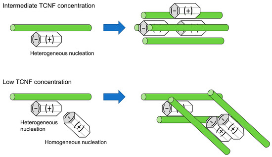 Schematic representation of the coprecipitation of TCNF and HAP. At an intermediate concentration of TCNF, heterogeneous nucleation of HAP on TCNF is the major pathway to produce an aligned composite. At a low concentration of TCNF, both heterogeneous and homogeneous nucleations occur to prevent the formation of the fibrous structure.