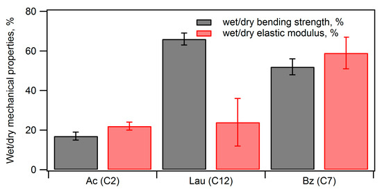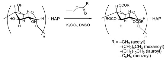 The composite of starch and hydroxyapatite was dispersed in a polar solvent, such as dimethyl sulfoxide or N,N-dimethylformamide, and heated at 60–120 °C for 4–8 h after adding vinyl carboxylate, such as vinyl acetate, vinyl hexanoate, vinyl laurate, and vinyl benzoate, and potassium carbonate (Figure 7) [92]. The progress of acylation was confirmed by the infrared absorption spectra. The absorbance at 1750 cm−1 for aliphatic acyl groups and 1728 cm−1 for an aromatic acyl group increased, indicating that the acylation of the hydroxy groups of starch proceeded. The water absorption rates were evaluated by immersing the molded compacts before and after acylation in water for 24 h at room temperature, as shown in Figure 8. The water absorption rate before acylation was 136%, and acylation significantly reduced the water absorption rate. In particular, benzoyl and lauroyl groups were effective in reducing water absorption. Furthermore, the bending strengths of acetylated, lauroylated, and benzoylated compacts after immersion in water were 17, 66, and 52% of those of the dry compacts (Figure 9). The elastic moduli of acetylated, lauroylated, and benzoylated compacts after immersion in water were 22, 24, and 59% of those of the dry compacts. Therefore, benzoylation of the starch–hydroxyapatite composite effectively improved the water resistance.