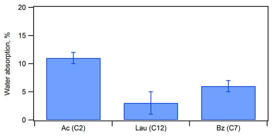 Water absorption of the compacts of PTS-HAP composites containing 66 wt% HAP, acylated with acetyl (Ac), lauroyl (Lau), and benzoyl (Bz) groups.