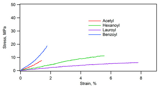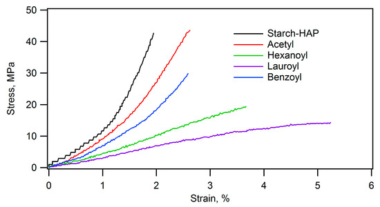 Stress–strain curves of the acylated composites of phosphorylated starch–HAP after immersion in water at 25 °C for 24 h.