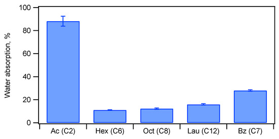 Water absorption of the compacts of TCNF-HAP composites containing 62 wt% HAP acylated with acetyl (Ac), hexanoyl (Hex), octanoyl (Oct), lauroyl (Lau), and benzoyl (Bz) groups.