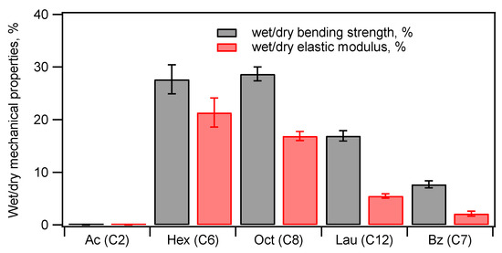 Through this approach, the bending strength and the elastic modulus of the composites were comparable to those of plastics (Table 2). Particularly, the elastic modulus exceeded that of plastics, indicating greater rigidity. However, these composites were not water resistant. When they were immersed in water, the molded compacts easily disintegrated, resulting in a loss of structural material functionality. To address this issue, we investigated how the partial acylation of hydroxyl groups in polysaccharides would impact mechanical properties and water resistance [92,93].