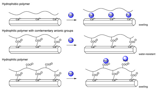Schematic representation of the water resistance of the composites of hydroxyapatite and hydrophilic and hydrophobic polymers. Appropriate hydrophilic/hydrophobic balance of the polymer is necessary for the water resistance of the composite.